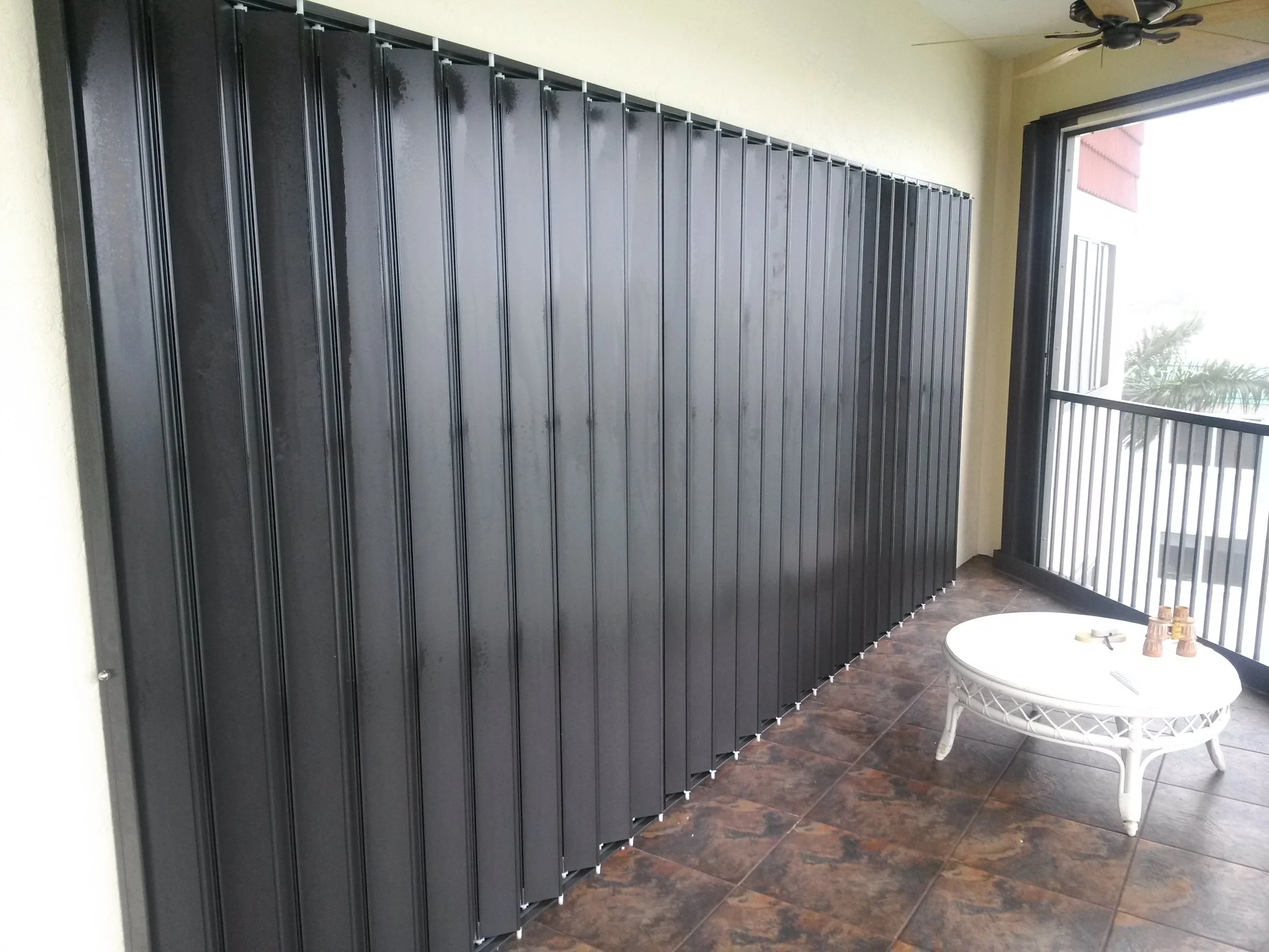 Perfect for bay windows, curved openings, balconies, storefronts, and more. Closes in seconds and adds protection from intruders, flying debris, and water intrusion.